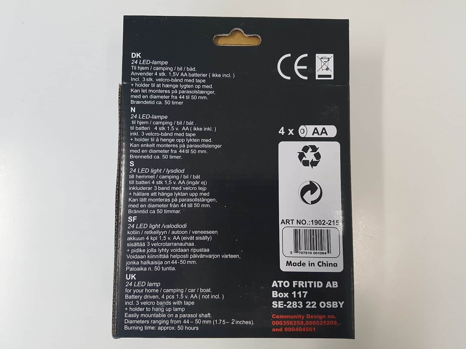 Inkl. 3 stk. velcro-bånd med tape + holder til at hænge lygten op med.