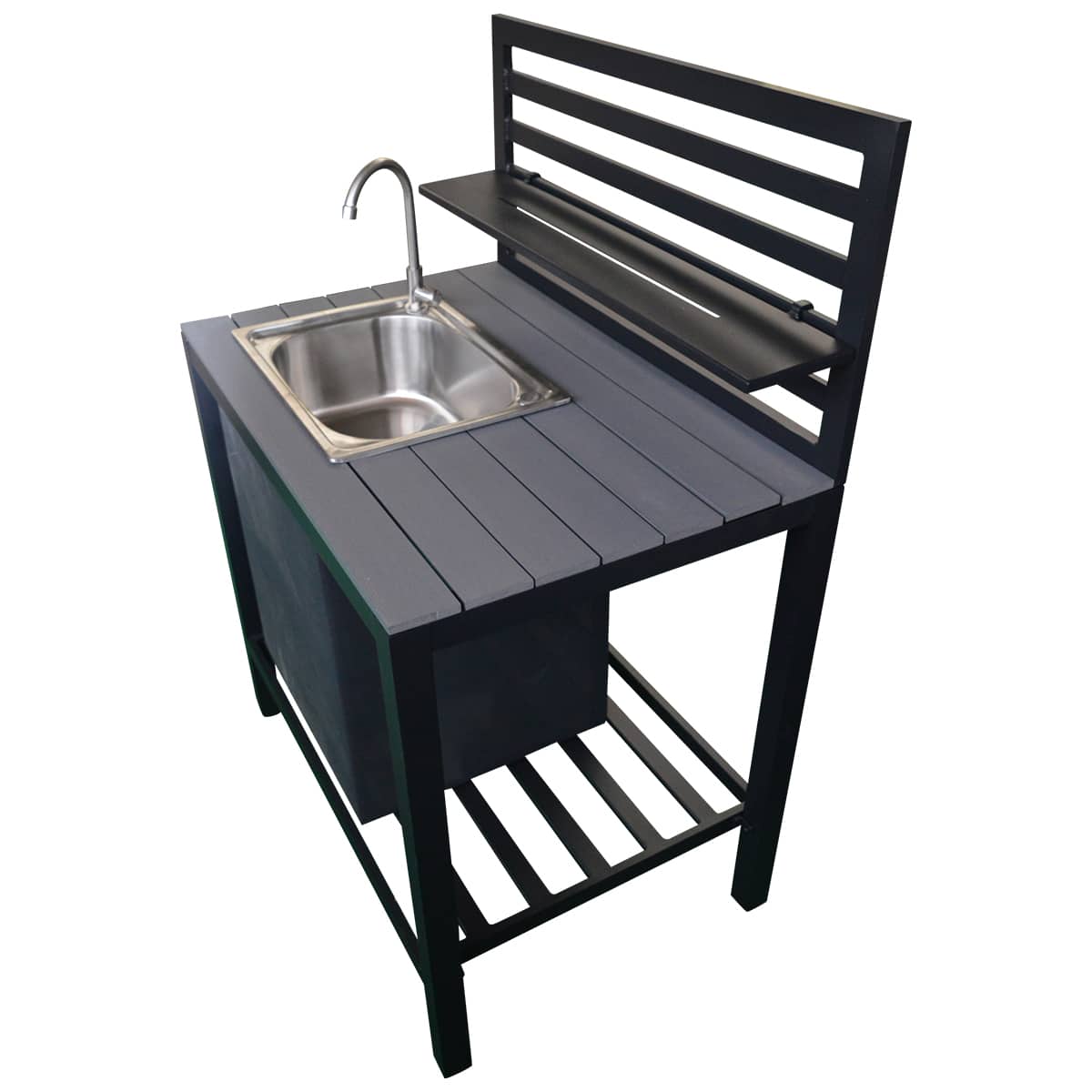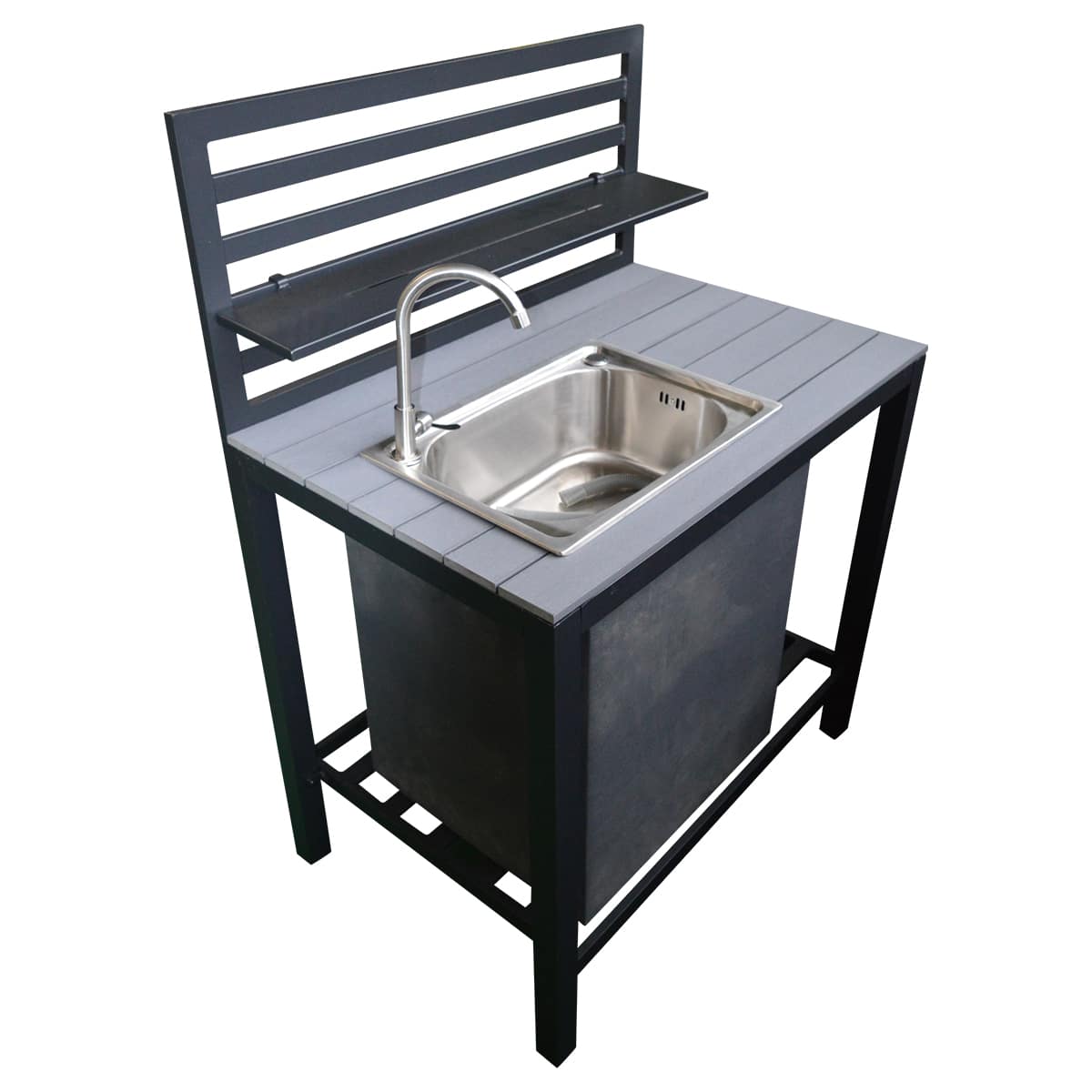 Køkkenet er fremstillet med en ramme i pulverlakeret aluminium med en topplade i non-wood lameller. Dertil en vask i rustfrit stål.