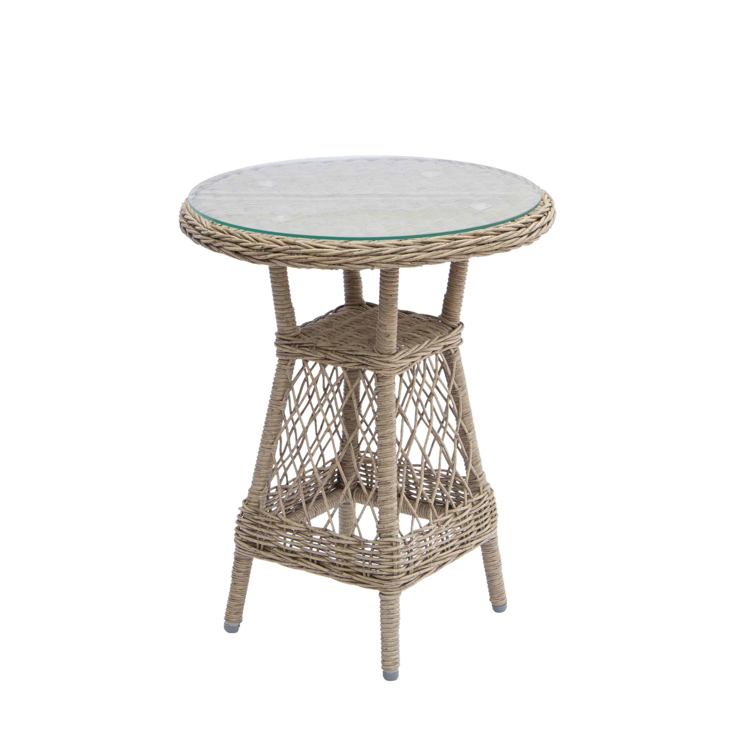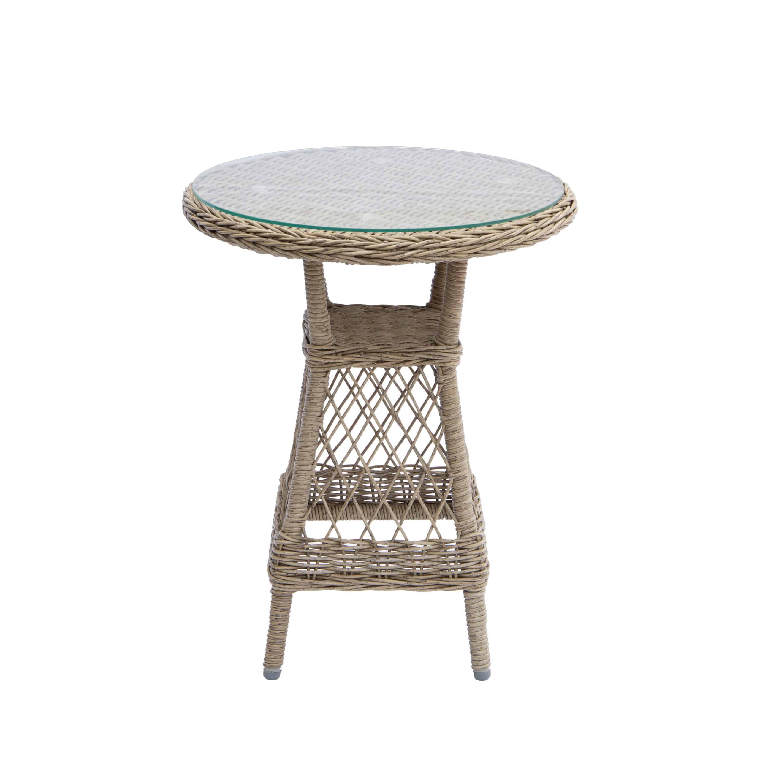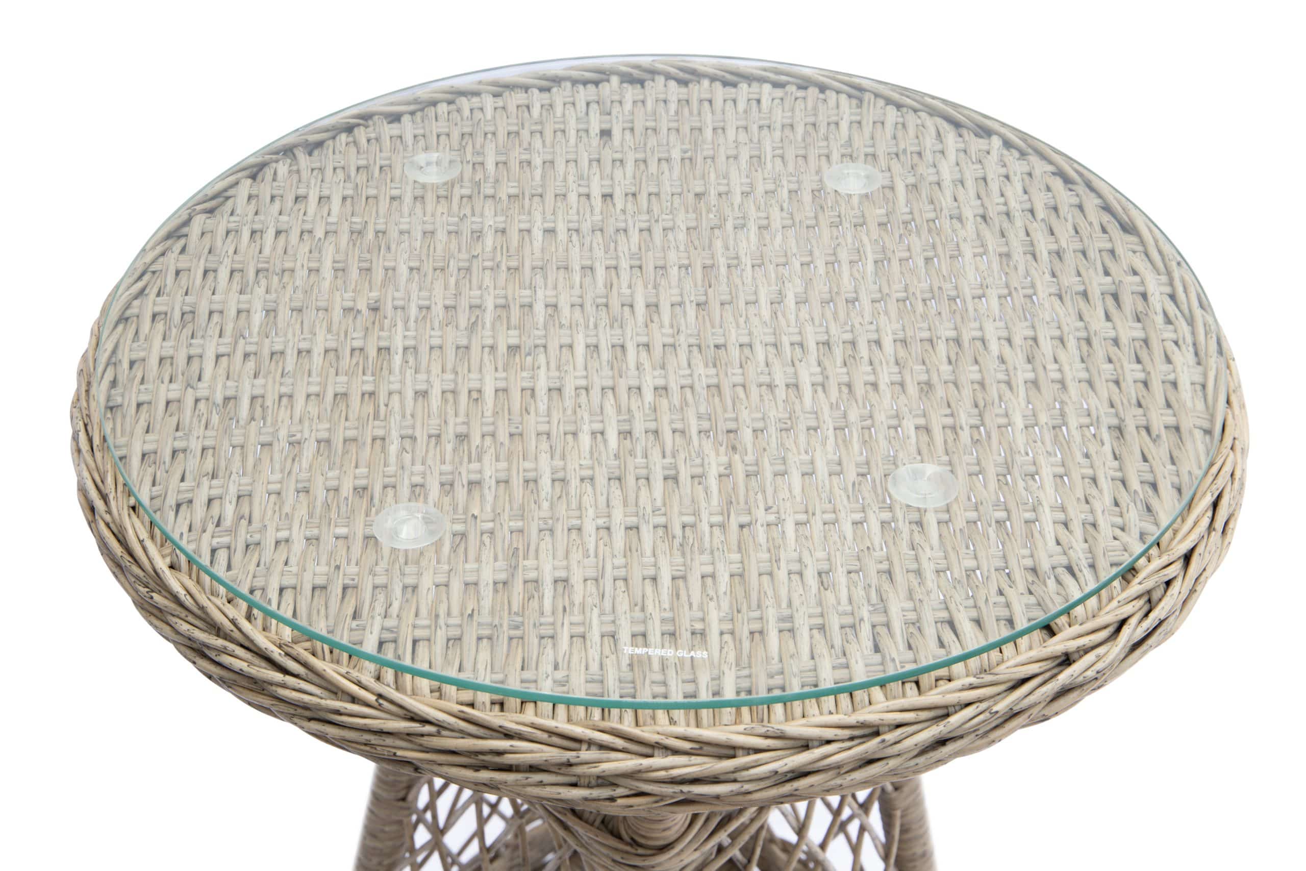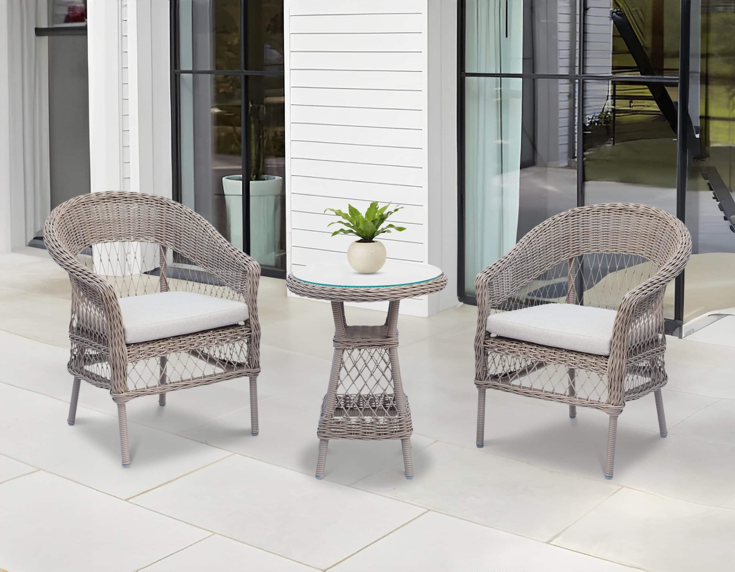 Dette altan- eller terrasse sæt består af et cafébord Ø52xH65 cm. med bordplade i glas og to loungestole med special tilpasset hynde.