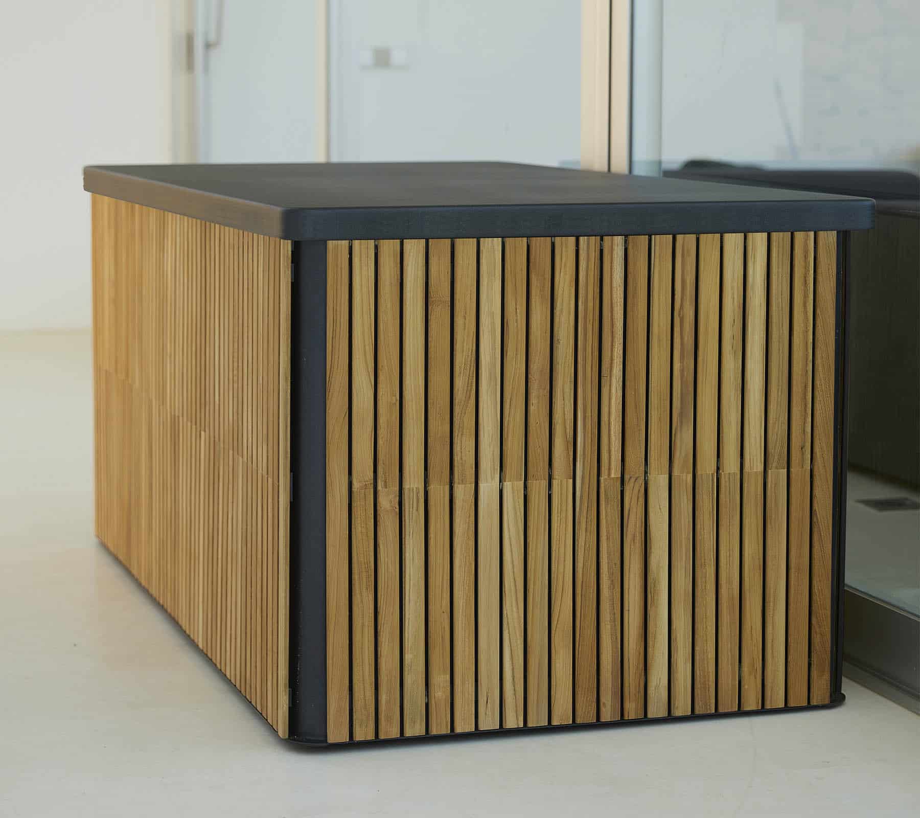 Combine er en række funktionelle og rummelige hyndebokse i lava grå pulverlakeret aluminium og lameller i certificeret luksus teak.