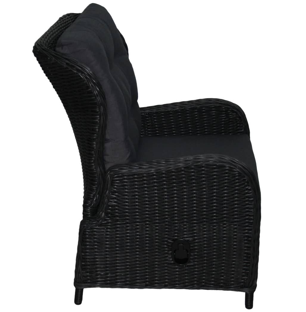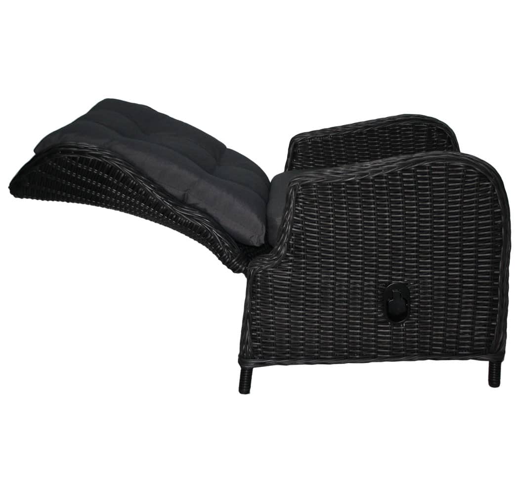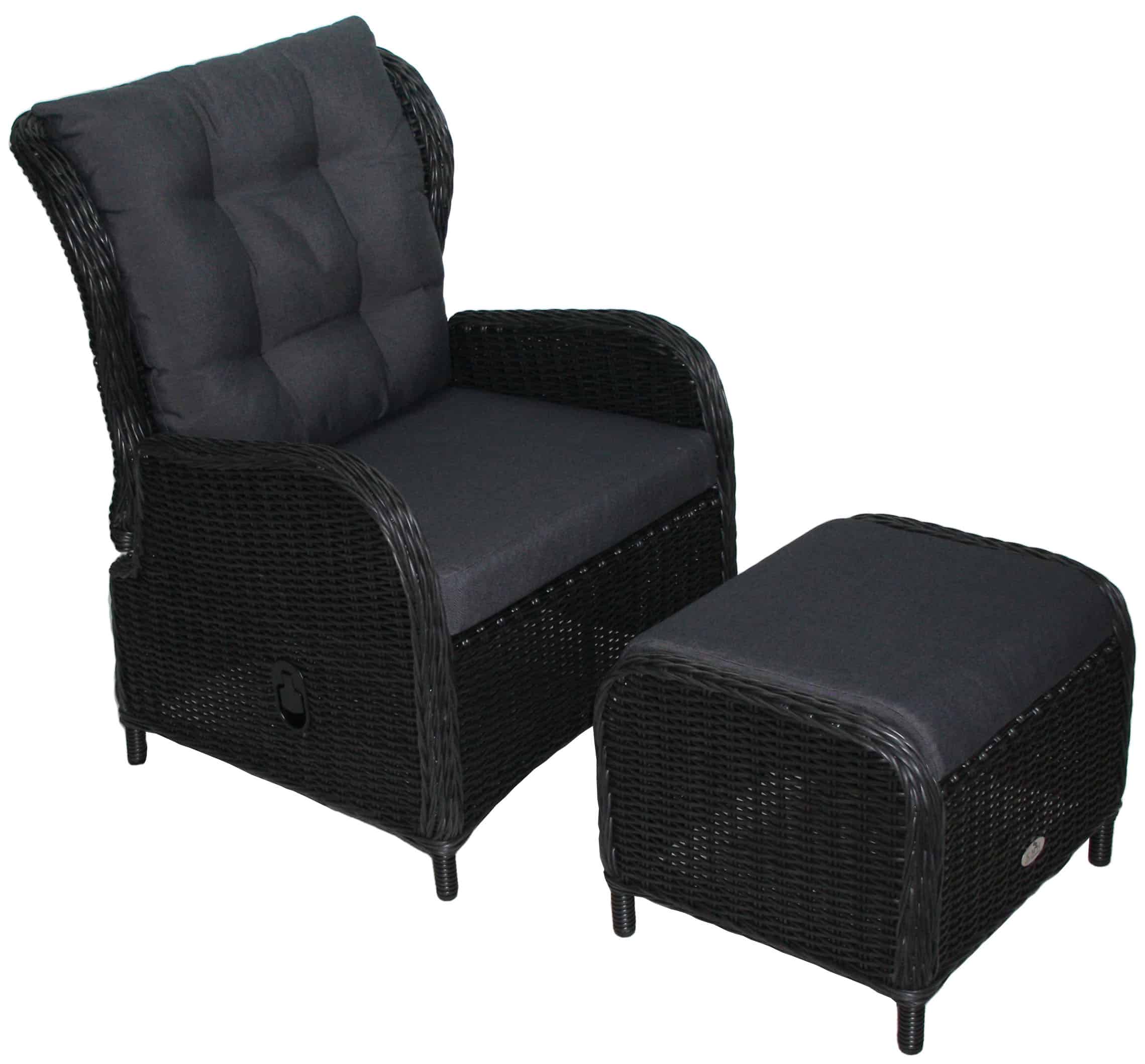 Vores Katharina loungestol med matchende fodskammel er fremstillet i polyrattan og forsynet med matchende gråsorte hynder.