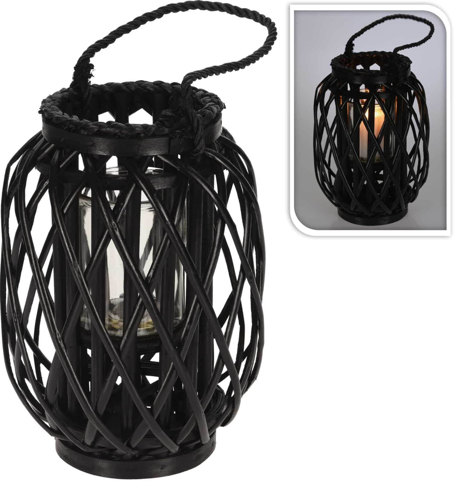 Lanternen er lavet af rattan, og har en hank i tovværk øverst, samt en glasindsats til bloklys eller fyrfadslys, der giver et smukt lysspil gennem det flettede mønster. Lanternen fås i flere størrelser.