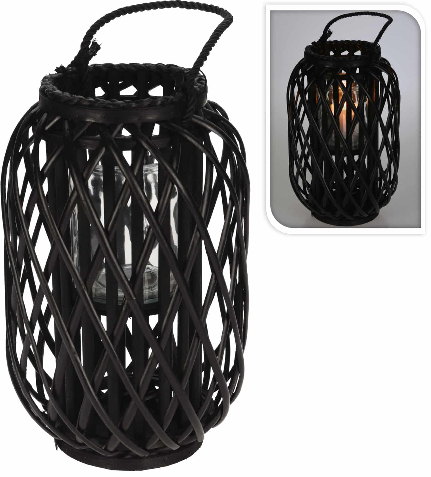 Lanternen er lavet af rattan, og har en hank i tovværk øverst, samt en glasindsats til bloklys eller fyrfadslys, der giver et smukt lysspil gennem det flettede mønster. Lanternen fås i flere størrelser.