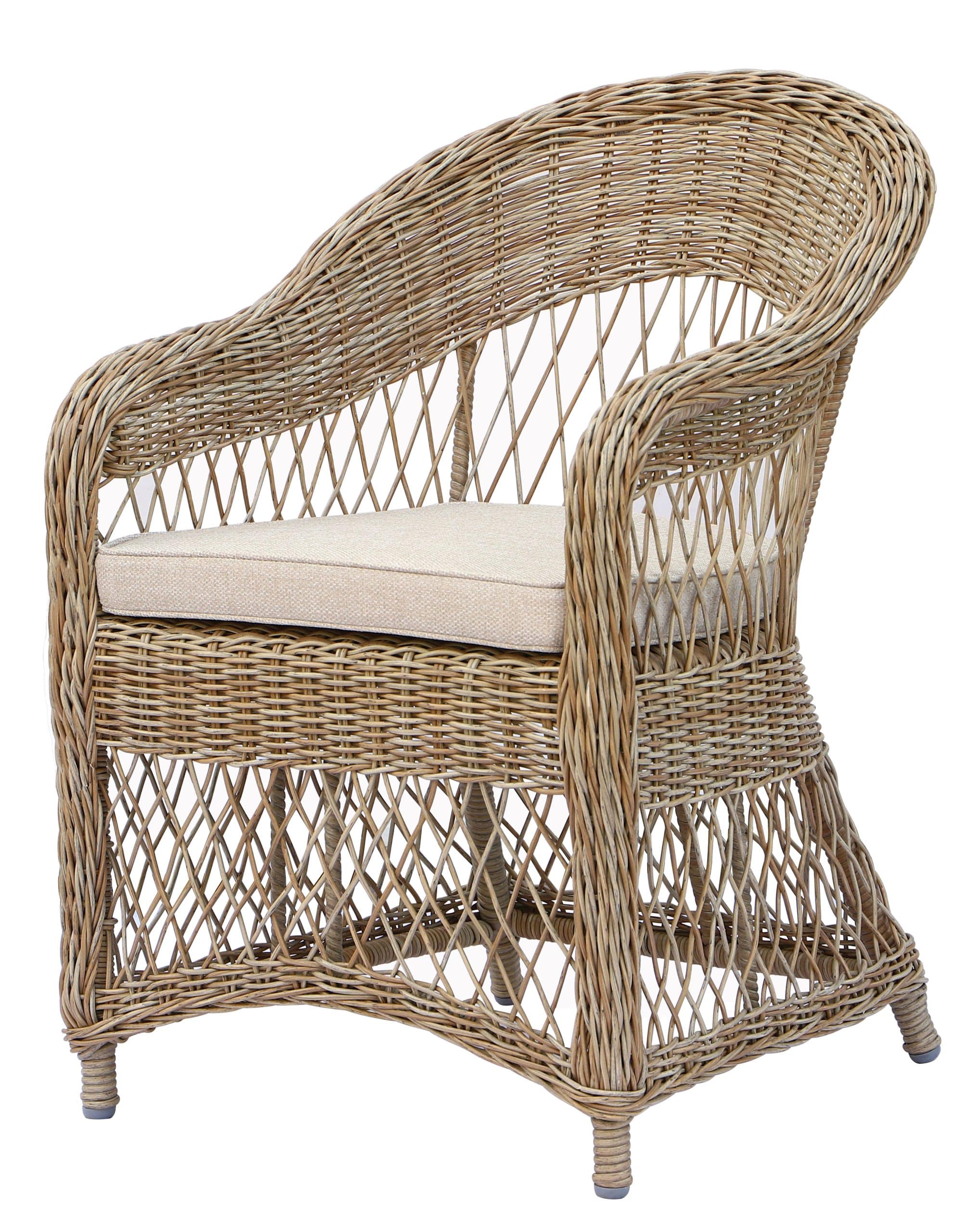 Den medfølgende sandfarvede hynde tilføjer ekstra komfort og fuldender stolens naturlige look. Kombinationen af de varme naturtoner og det elegante flet gør stolen til et stilfuldt valg til både spisepladsen og terrassen.