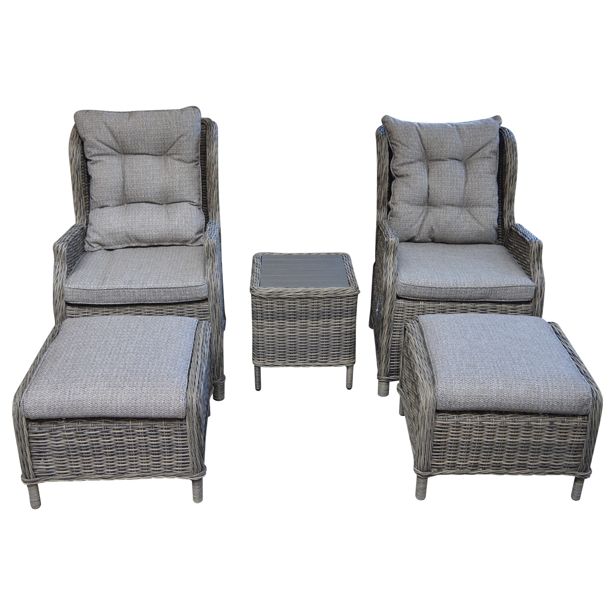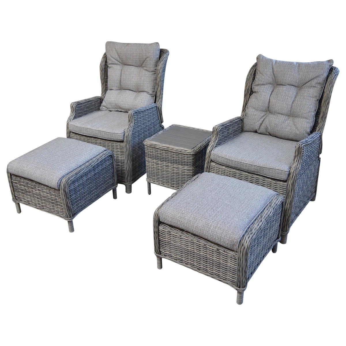 Vores New Sofia hyggesæt i antik grå polyrattan består af to positions lænestole samt to fodskamler samt et sidebord fremstillet i polyrattan med bordplade i nonwood lameller.