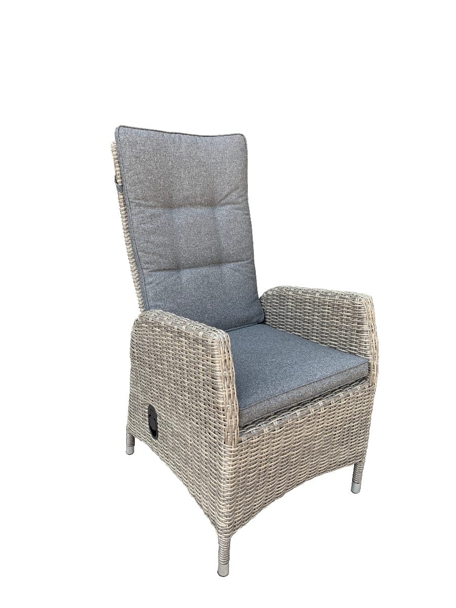 Opgrader din udendørs oplevelse med vores New Sofia positionsstol i antik grå polyflet.