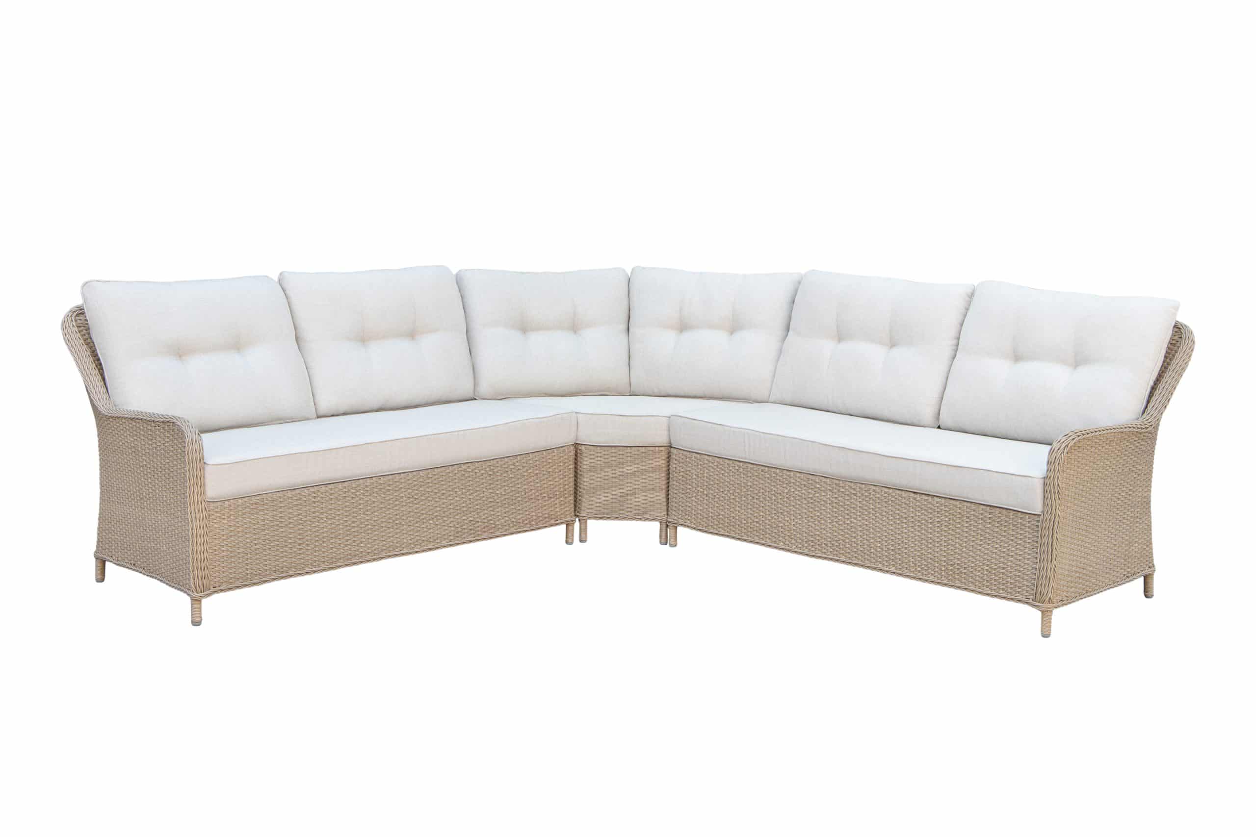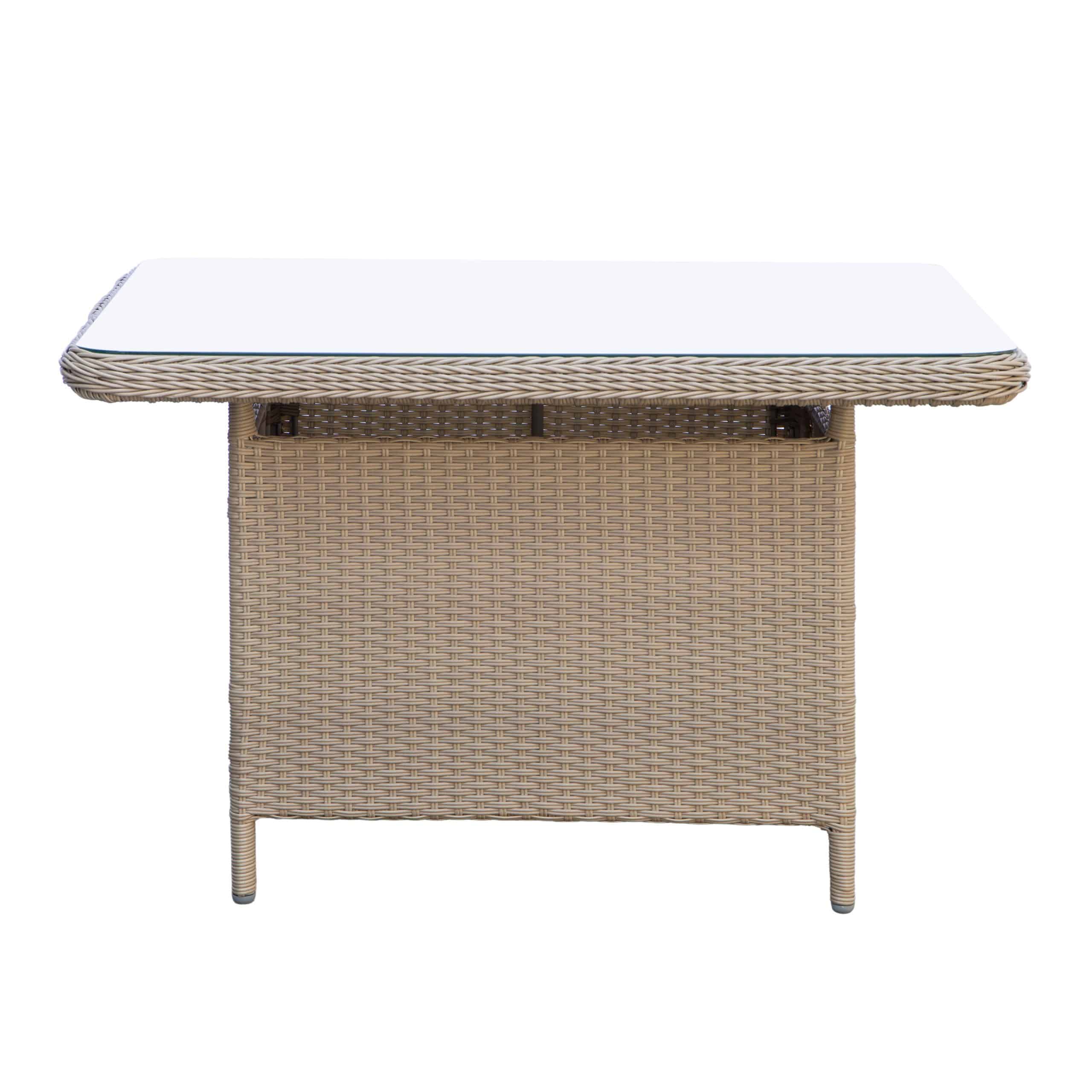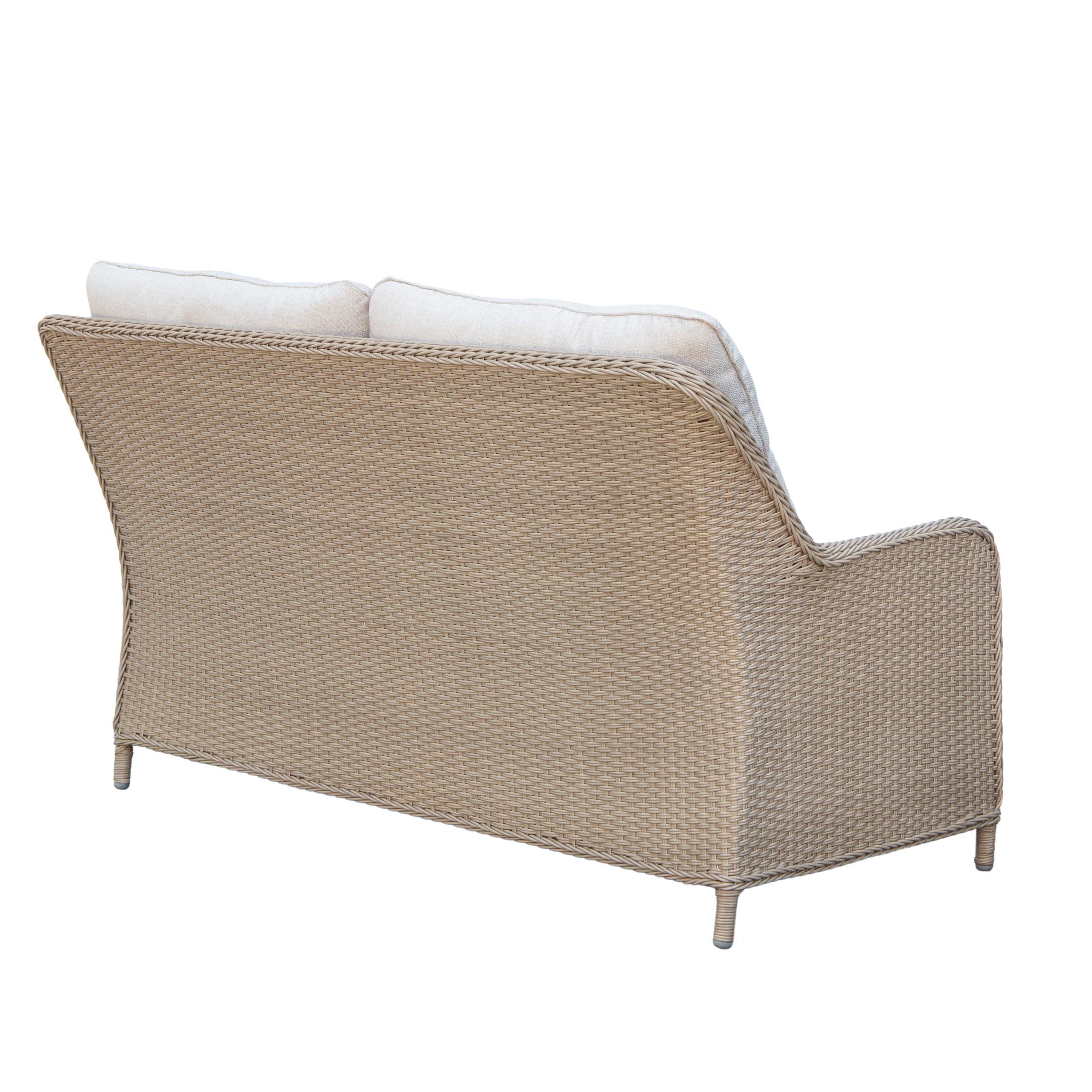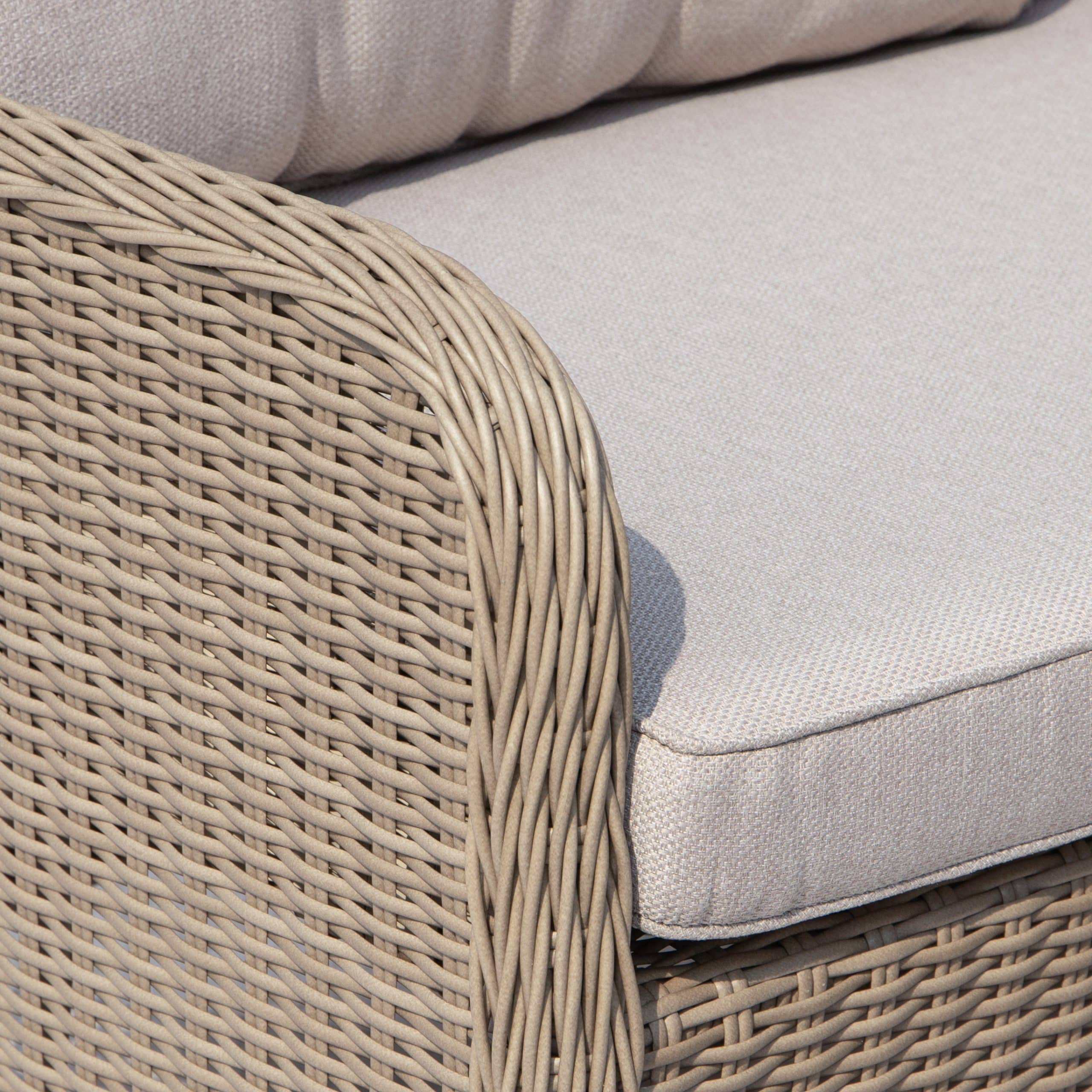 Sættet er fremstillet med et robust aluminiumstel, som sikrer lang levetid og minimal vedligeholdelse. Det er beklædt med slidstærkt sandfarvet polyrattan flet, der giver et naturligt og tidløst look, som passer ind i enhver have eller terrasse.