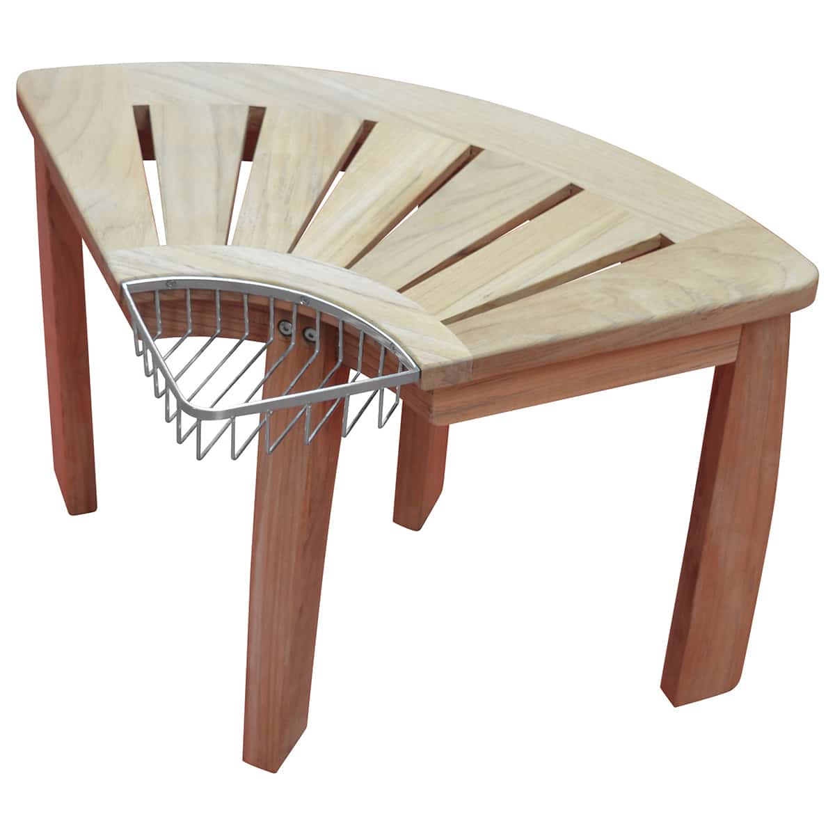Bænken er udført i luksus teak og med en praktisk gitterhylde.
