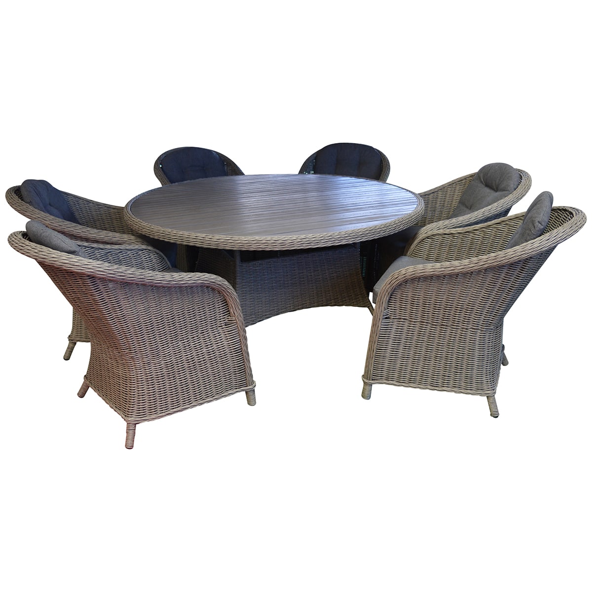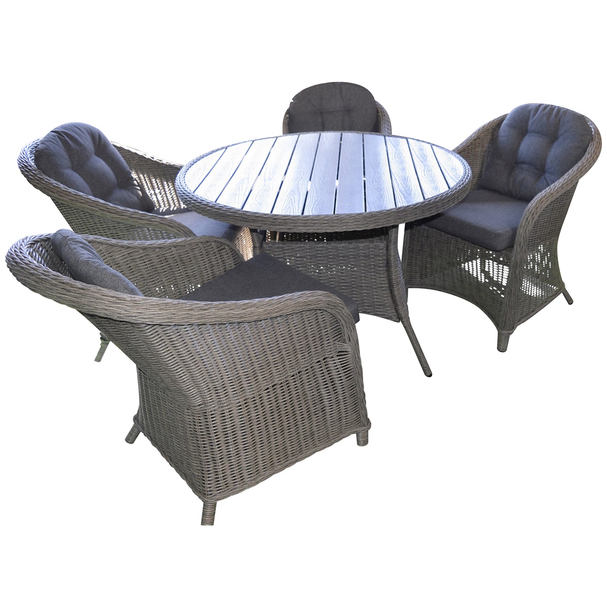 Det runde bord fuldender sættet med sin praktiske størrelse og stilrene udtryk. Bordpladen er lavet i slidstærkt non wood materiale, som kombinerer det naturlige trælook med minimal vedligeholdelse. Materialet er modstandsdygtigt over for vind og vejr, hvilket gør bordet perfekt til udendørs brug året rundt.