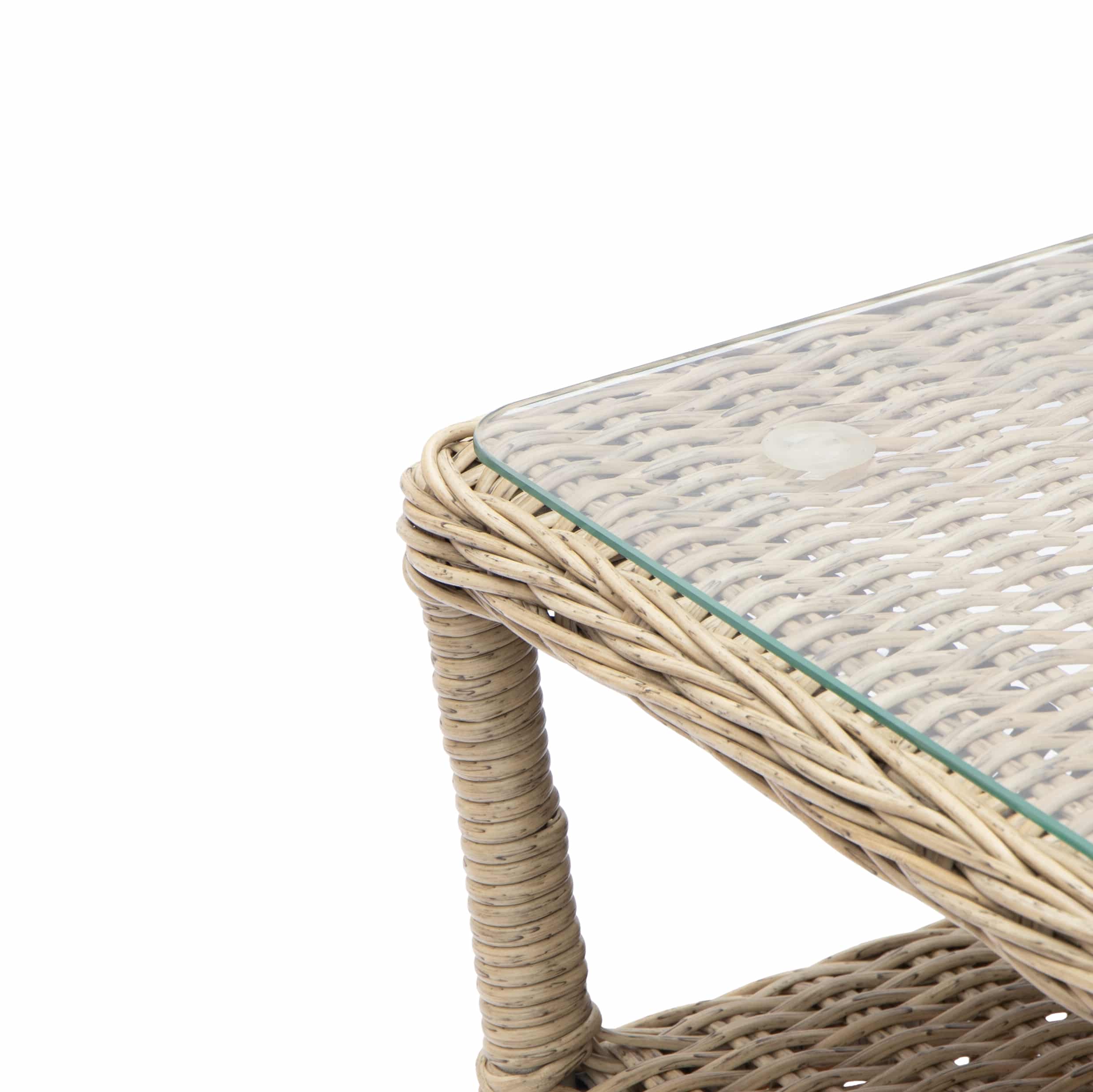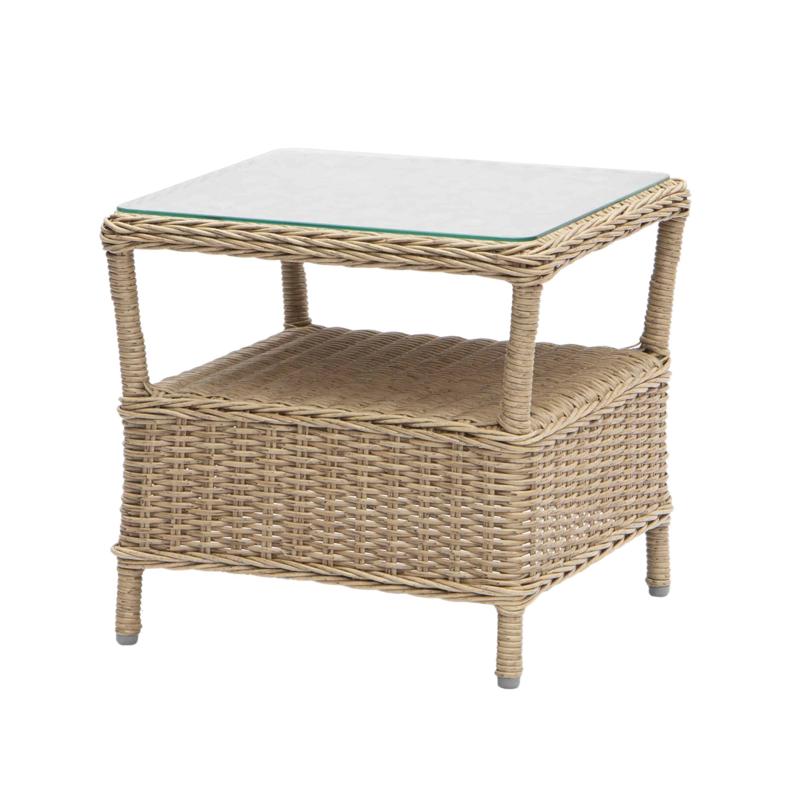 Vores Stavanger hyggesæt består af to positions lænestole, to fodskamler samt et sidebord fremstillet i polyrattan og med glas bordplade og praktisk hylde til eksempelvis blade og magasiner.