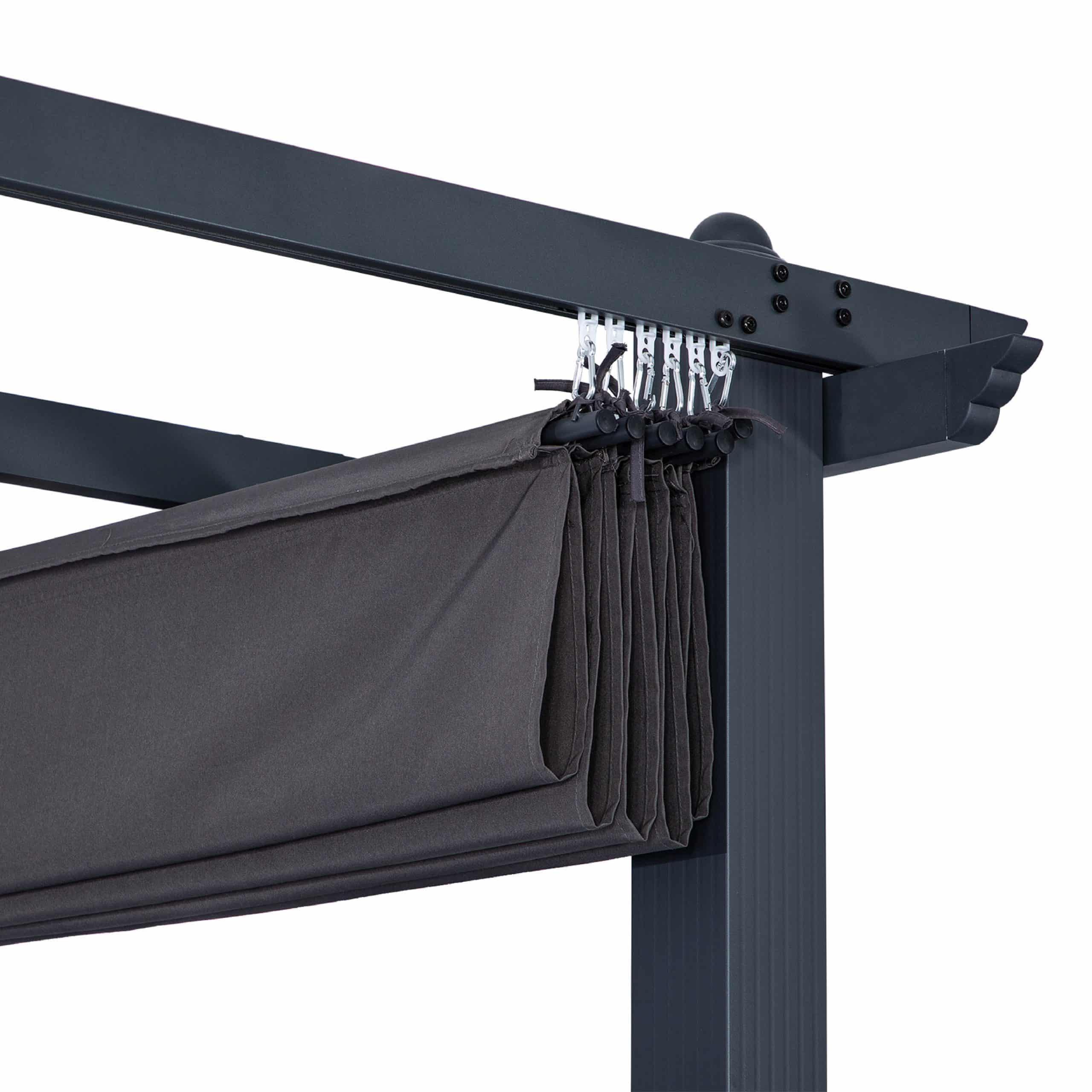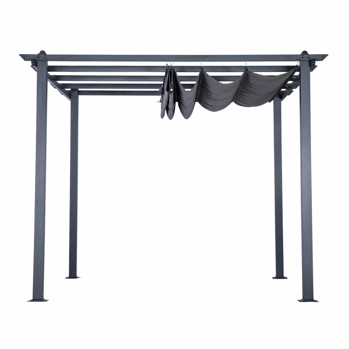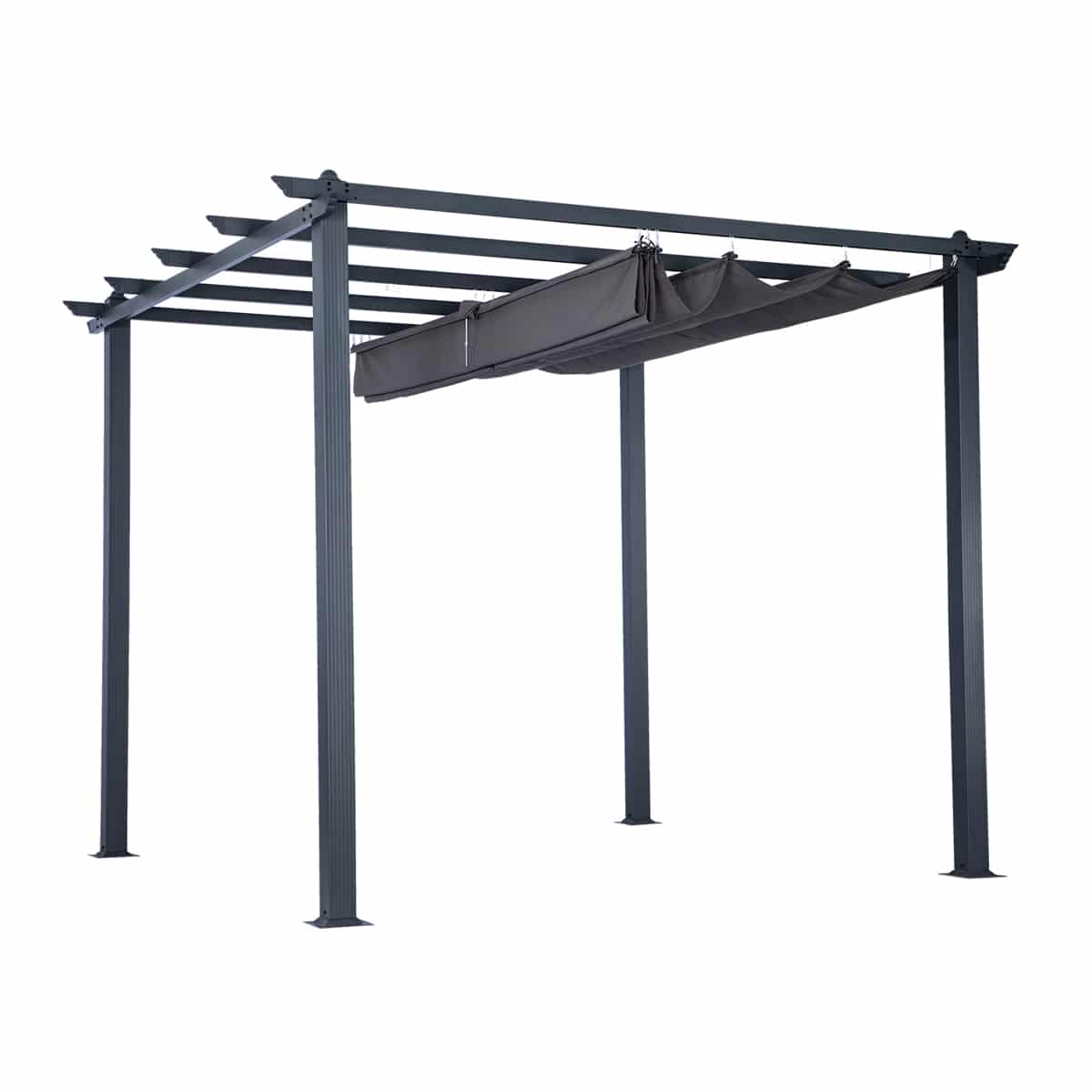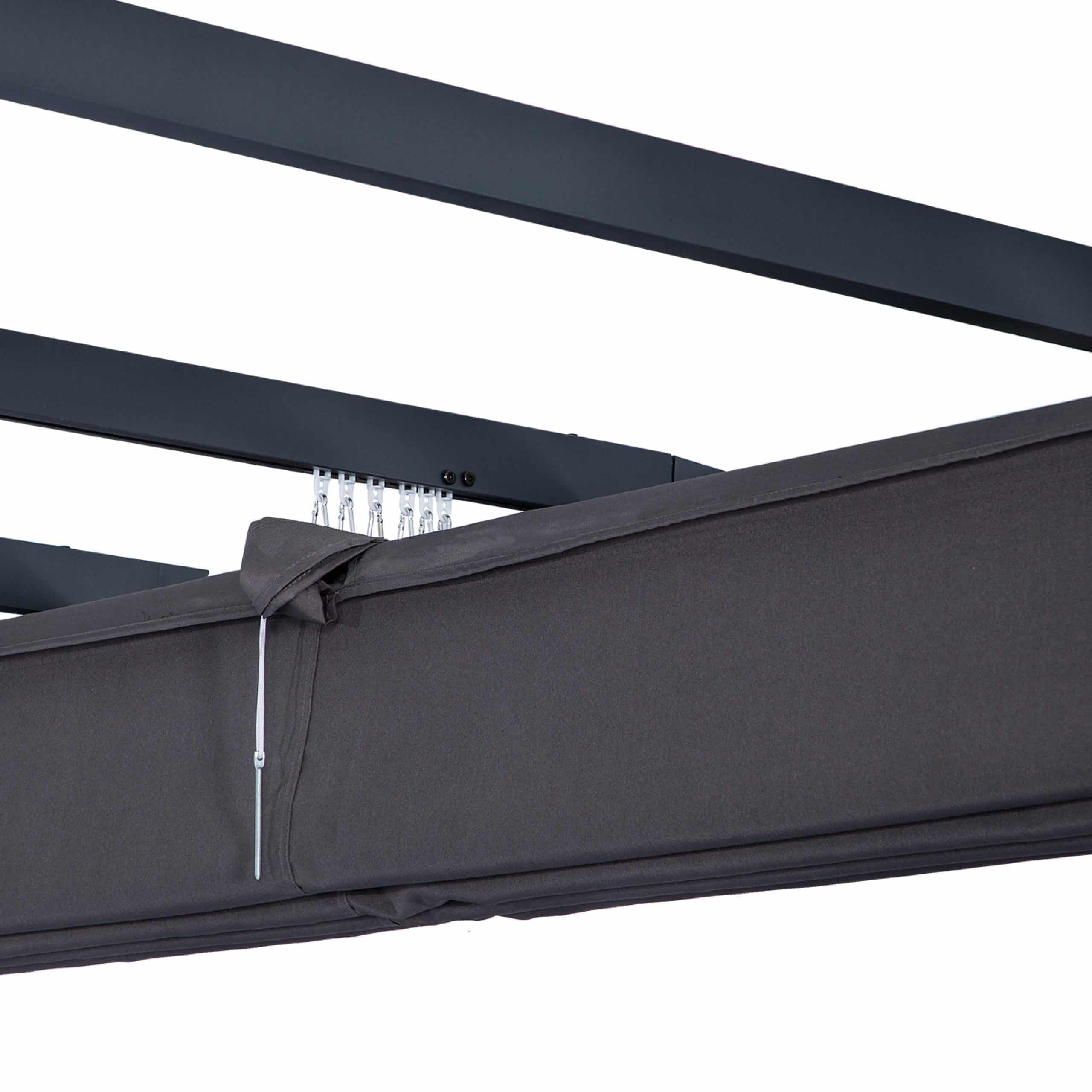 Valetta pergola med tag lavet af polyesterstof der kan trækkes ud efter behov og med et stel i gråt pulverlakeret aluminium. – perfekt til alle døgnets timer og vejrskift på terrassen eller i haven.