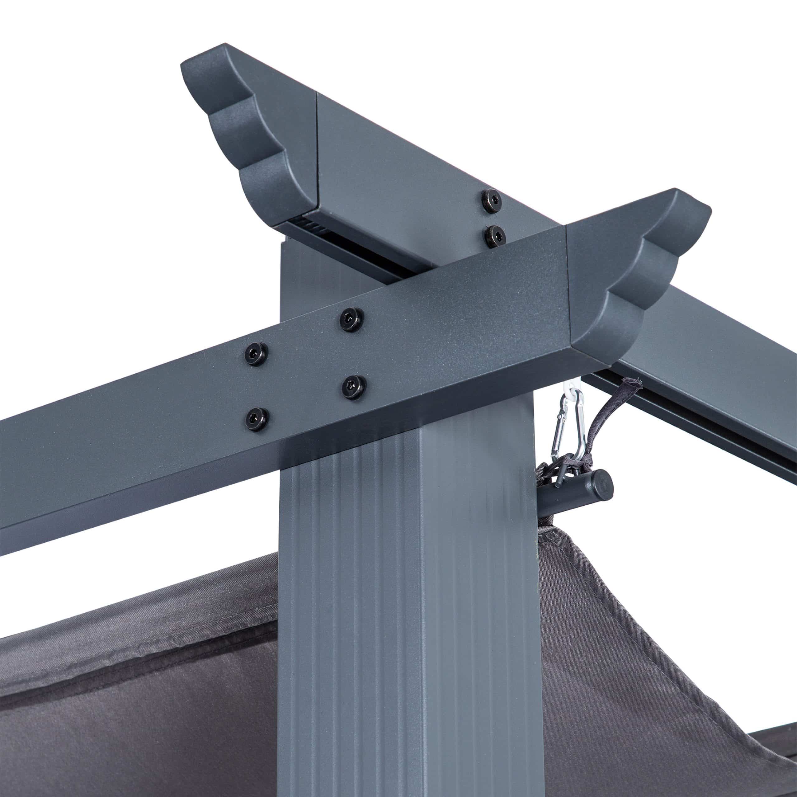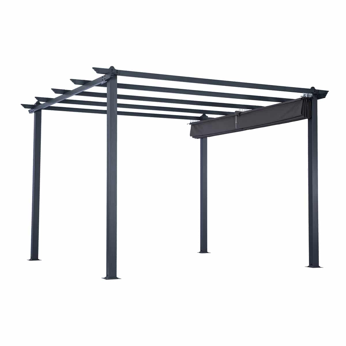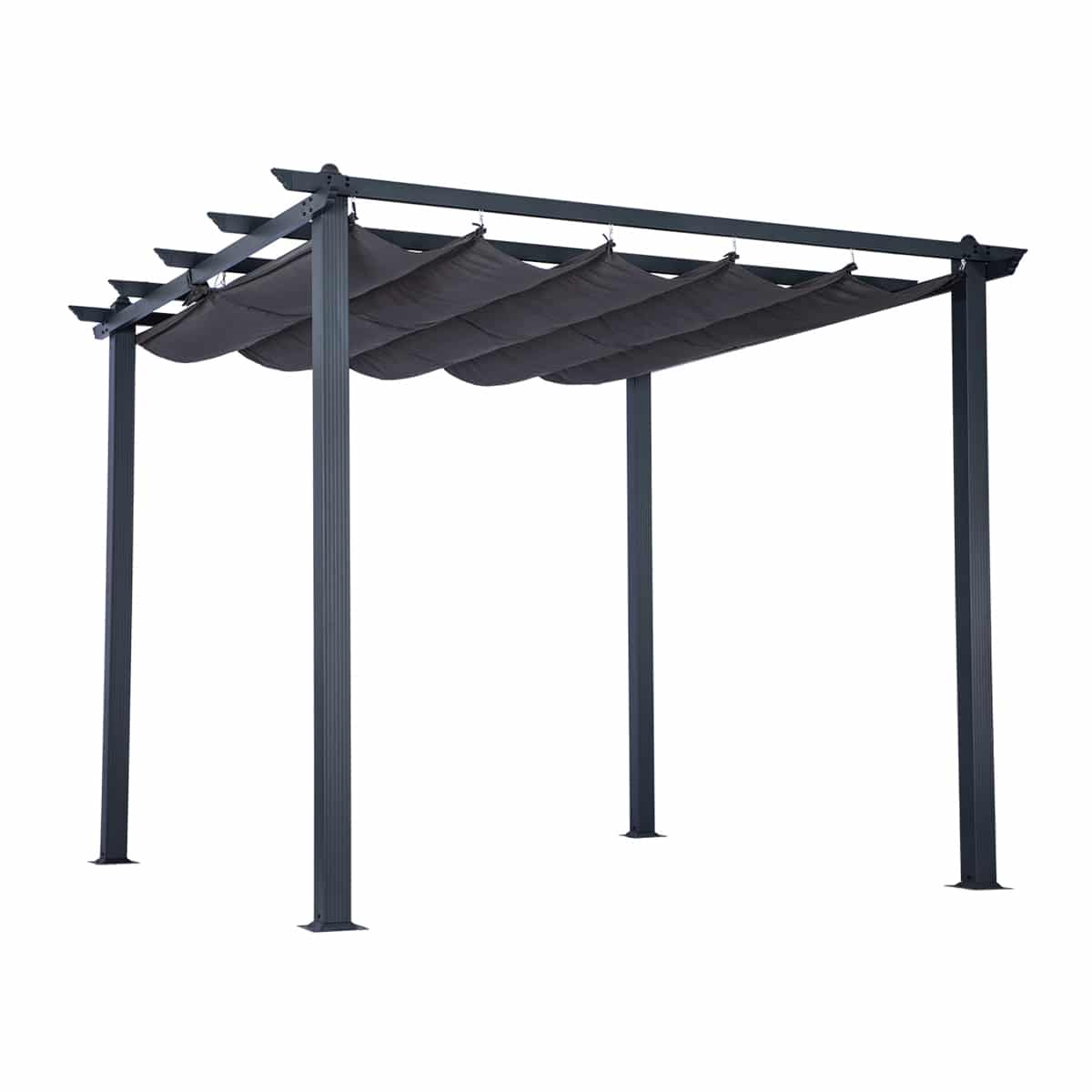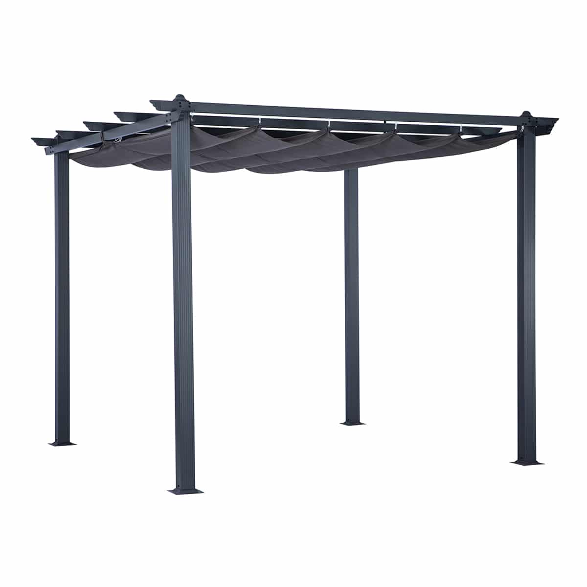 Valetta pergola med tag lavet af polyesterstof der kan trækkes ud efter behov og med et stel i gråt pulverlakeret aluminium. – perfekt til alle døgnets timer og vejrskift på terrassen eller i haven.